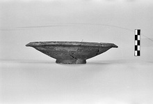 Description:   Full profile preserved, about one-third of side missing. Restored in plaster. Downturned rim with groove near upper edge; small ring foot.