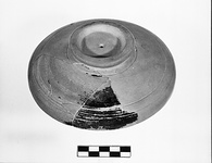 | Description: | About one-third preserved, from base of central knob to edge. Shape similar to P 14419 (Χ 976), but larger. Three grooves at outer edge of top surface, one at inner edge. Black glaze mostly gone from outside; traces of garland in yellow? Fragments of several similar lids stored in B 150 b. | |
