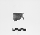 Description:   a) Bit of shoulder and concave rim with out-turned lip. Base of handle attachment on outside of rim suggests a horizontal strap handle.