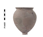 | Description: | About half of rim and fragments of wall missing. Restored in plaster. Small flat-bottomed knob as base; deep ovoid body; short concave neck; flat-topped rim. Buff clay. Traces of black glaze on inside. | |
