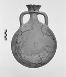 Description:   No part of bottom preserved; pieces from sides and lip also missing. Restored in plaster. Both sides, shallow convex; short narrow neck with high flaring lip; two grooved handles. Ridge at base of lip on line of upper handle attachment.