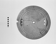| Description: | One piece and a chip from lug missing. Restored in plaster. Heavy disk with two shallow grooves on top surface near edge; hole pierced through center; near edge a pair of holes and a ridge; a niche in rim. Reddish-buff clay. Light slip. Coarse heavy fabric. ADDENDA Fragments of at least two more in tins. | |