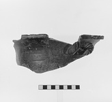 | Description: | The fragment includes parts of the upper walls, the flaring rim, and one twisted horizontal handle. The lip is bent over and grooved outside. A large bowl, with moulded decoration of Erotes with garlands flying toward a large vase. A heavy wheelmade rim has been added. At the pint of attachment is a band of red color, much worn. A similar red stripe around a groove just inside the rim. For the shape cf. P 1495. Gray clay and thin dark gray metallic glaze, recalling the Cnidus lamps, T XIII. | |