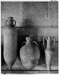 | Description: | Mended from many fragments; pieces of wall missing. Tall irregularly cylindrical body with pointed toe; sloping shoulder, tapering neck with thick rolled lip; handles from shoulder to below lip. Pinkish clay with thick yellowish gray slip. | |