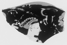 | Description: | Fragment from upper wall, broken all around. Head of woman to right, her right hand raised behind her head; vine tendrils above. At the right of the fragment, part of a thyrsos. White for flesh and tendrils; thinned glaze for eye, hair, earring and necklace. Dull glaze. | |