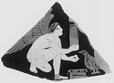 | Description: | Fragment from a lekanis lid; black glazed beneath. Eros, right, kneeling on one knee, and holding a large alabastron in his outstretched right hand. In front of him on the ground, a box; facing him, over the box, a bird toward which Eros, in his left hand, extends a small round object. White for Eros's flesh, with yellow over-painting; his curly hair brown to black; brown details on his wings and on the bird; white for the small object. Added clay for Eros's fillet. | |