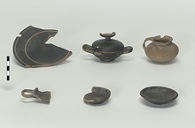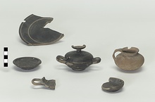 | Description: | The bowl mended from six fragments, the lid from four. A large part of one side of the bowl and two small bits from the rim of the lid missing. Black glaze over all, save for the resting surface of the broad ring base and the top of the knob of the lid, which is sunken in the center, reserved and decorated with glazed bands. A thin reserved line around the rim of the lid. The handles have projecting ears at the sides. Lustrous black glaze, mottled with gray and red in the firing. Cf. Agora XII, no. 1222 and CVA Oxford, 1, p. 48, no. 17 and 2, 11 and 14, "5th. cent." with somewhat flatter topped lids. Cf. 4th. c. grave in ΠΘ: ΠΘ 1410-ΠΘ 1419 and page 1582ff. in ΠΘ notebooks. | |