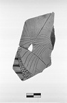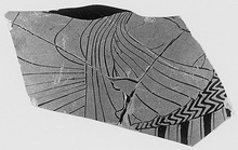 Description:   From the wall of a column krater; streaky black inside. Preserved is the midpart of a partly draped figure, reclining to left on a cushioned couch. Dilute glaze for muscles; no relief contour.