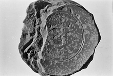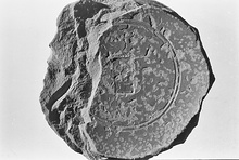 | Description: | The bottom of a Samian B bowl with ring foot. A groove around the center of the floor. Rectangular stamp illegible. Glaze much pitted; light reddish-brown micaceous clay. | |
