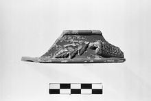| Description: | Part of the floor and rim of a large flat-floored Western Sigillata bowl with vertical rim. In relief on the outer face of the rim, a leaf, and an ear of corn-like object. Rim thickened above and below. Cinnamon-brown clay; good red glaze considerably chipped. | |