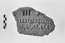 | Description: | Fragment of the bowl below the rim. Relief bands, from above downward: triglyph-metope band, rosettes in metopes; dentils, egg pattern; triglyph-metope(?). Coarse micaceous red clay with grits; much burned on the lower part of the bowl, inside, and on the outside. | |