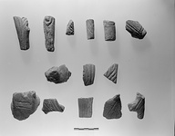 | Description: | Appears to preserve full height of the slightly flaring high mouth and plain lip of a jar. Incised oblique lines on outside. Coarse gritty brown clay, largely fired black. | |