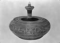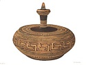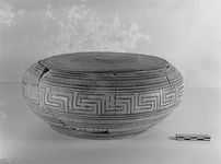 Description:   Mended from many pieces; the lid complete except for a chip from the knob, the tip of the handle, and small chips; the bowl complete save for a few small bits of wall and rim, and chips to the surface. Deep round-bodied pyxis on low ring foot; horizontal flange inset below top of wall to receive lid. Flat lid with tall central handle, composed of a high stem, a large roundish knob, and a small tip. Two string holes in rim and flange, on either side.