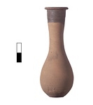 | Description: | Intact. Drop-shaped body, flattened at the bottom; tall neck with out-turned lip. Pinkish-brown clay; lip and upper part of neck dipped in thin black glaze. | |