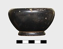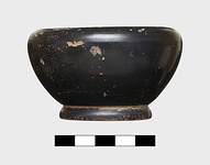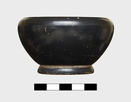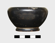 | Description: | Intact. Broad ring foot, steep slightly rounded walls thickened at the top to form rounded incurving lip. Very heavy fabric. Good black glaze over all, except for scraped grooves at junction of foot and wall, resting surface of foot, and space inside foot, decorated with a broad and two narrow glazed circles. | |