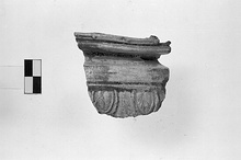 | Description: | Rim fragment. Projecting rim, grooved on outer face, above a low neck. In relief on the shoulder, egg pattern. Red clay; vitreous green glaze. | |