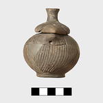 | Description: | Small fragments of body and rim restored. Round-bodied pot on ring foot; two lug handles, pierced by string holes, at the rim. The body grooved vertically, from foot to shoulder, on the shoulder, incised decoration of double zigzag; incised zigzag also on lid, and checkerboard on flattened top of knob. Leaf-shaped lid, pierced near the ends to correspond with string holes on body. Fine clay, with slightly burnished surface. Handmade. | |