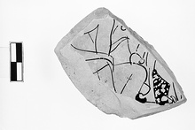 Good black glaze, badly chipped; thick lines for relief contours and interior drawing.