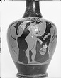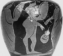 | Description: | Mended from several pieces. Most of the trefoil lip and much of the right side of the body missing. Egg-shaped body; flat bottom, projecting; narrow neck; handle round in section attached so as to form a large projection on the upper face of the lip. Tongues between bars on shoulder at front. Below, three youths; he at the left, cloaked, facing right and holding a large tympanum(?); he in center, nude, also right, and holding a similar object; he at the right, cloaked, facing left, and holding a large aryballos. Thick glaze, except under foot and below neck inside. The background glaze has slopped over the tongue pattern at the right above. | |