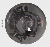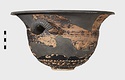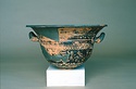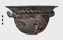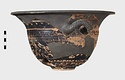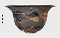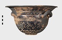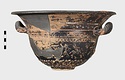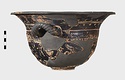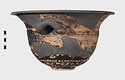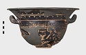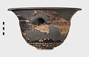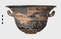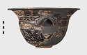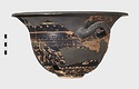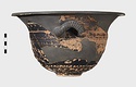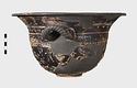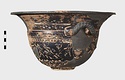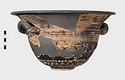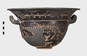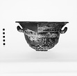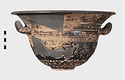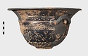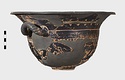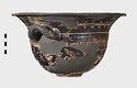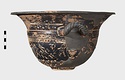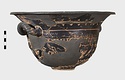 | Description: | Fragmentary; more than half of the walls preserved, but none of the lip. A large bowl with typical Megarian decoration, to which a base (small ring, perhaps not complete, preserved) and a flaring wheelmade rim have been added. At the junction of the two, on the line of the twisted horizontal handles, a scraped groove colored with miltos. Bowl: bottom, central rosette, from which rises an imbricated leaf pattern; central band, young satyrs with winged horses, in the field large goat masks; upper border, bands of egg and dart, dots, and small palmettes above spirals. Rim: painted inside and out in white and clay-colored paint ("west slope style"). Ivy pattern on both sides of a white band, outside; inside, pendent drops and garlands, in clay color with remains of white. On the bottom, inside, a scraped circle (Diam. ca. 0.11m.) enclosing four lines of clay color intersecting at the center. Good metallic black glaze inside and out, somewhat worn on the outside. | |