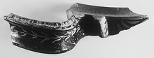 | Description: | More than half of a broad horizontal handle is preserved, with a projecting ear beside its attachment to the vase, which has a flange for a lid. Ovolo pattern on the top of the handle; coarse palmette on the body of the vase. On the outside of the handle, painted over heavy brownish glaze, a branch, in thick clay-colored paint, with traces of gilding. The inside of the bowl glazed; the flange reserved and painted red; the inside of the handle reserved. Cf. P 19251 (ΠΠ 458). | |