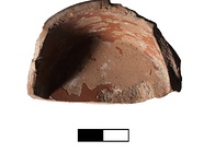 | Description: | Small bowl, about half preserved. Very low ring foot; high vertical rim, keeled below, out-turned above. Very micaceous buff clay; light red glaze, considerably worn. Samian. | |
