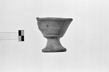 Description:   Broken, part of rim missing; otherwise complete; possible trace of handle at break in rim. Small, flaring-rimmed goblet on high hollow splayed foot. Covered inside and out with a coat of thin tenacious white paint.