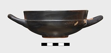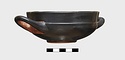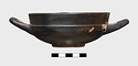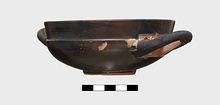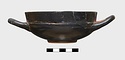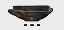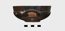| Description: | One handle missing, and part of rim. Very low ring foot; nearly vertical lip, lightly inset. Restored in plaster. Excellent black glaze; reserved, inside of handle and handle spaces, lower edge of foot and resting surface, center of space within foot, with glazed circle and dot. Pink wash prominent on reserved surfaces. Lightly scraped groove around wall just above foot. | |