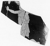 | Description: | Wall fragment (a) from a sizable skyphos. At left, part of a draped figure; at right, part of the palmette decoration from beneath the handle. Black glaze somewhat grayed; no relief contour. ADDENDA A fragment added from sherds joins at left and gives part of the rim and the upper front part of the figure. A youth with his himation wrapped around his left arm, leaving the upper body free; a staff in his outstretched right hand. Mouth painted in brown; brown also for locks and for musculature. The chest outlines are continued so as to give a little relief contour on the upper body. | |