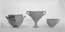 | Description: | Three joining pieces preserve the cup complete. Deep cup on low ring foot, plain slightly flaring lip, narrow ribbon handle from lip. Fine pinkish-buff clay, buff at surface; traces of buff slip. Inside water-proofed in matte red glaze; bands of same on handle. | |