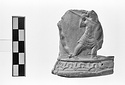 | Description: | Three joining fragments preserve part of a hollow stand, probably from a shape such as P 15163 (ΕΕ 196). In relief on wall, lower part of seated figure, right, then a nude figure, left, and a heavy-armed figure, right. At bottom, debased Lesbian leaf. Buff clay; traces of white. | |