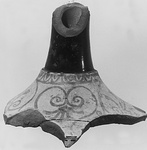 | Description: | Mended from two pieces. Shoulder decorated by a series of three palmettes with tendrils, bound above by a band of ovules. These in red on white ground; the neck above in glossy black glaze. Pinkish-buff clay. | |