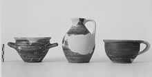 | Description: | Handle, most of neck and lip and part of wall missing; restored in plaster. Small flat-bottomed Subgeometric jug or olpe; short neck, forming continuous curve with shoulder; round mouth. Thin streaky brown wash outside, except on bottom. | |