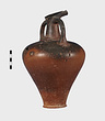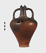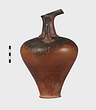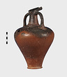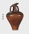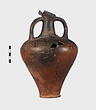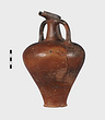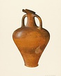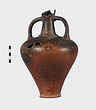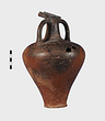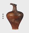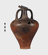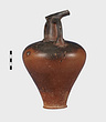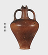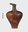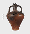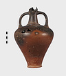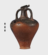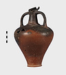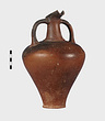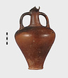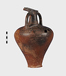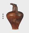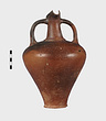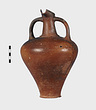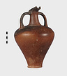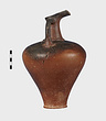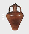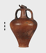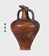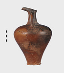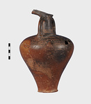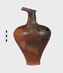 | Description: | Mended from many pieces. A few small fragments of body missing; also numerous minor chips. Mouth has cut-away projecting spout. Two handles, round in section from shoulder to near top of spout. Narrow neck with raised ring at base; broad shoulder. Body tapers sharply to small flat bottom with false ring foot. Fine reddish-brown clay. Rather flaky glaze fired unevenly red to black. ADDENDA "Base ring ware," Cypriote, wheel made, ca. 1400 (Astrom-Merrillees 1/5/62). | |