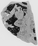 Description:   From a large lid; the underside glazed, with two reserved bands. Part of a draped woman running left, looking back and carrying two lebes gamikoi. Eros (white face and hands) at left. Double reserved band, and trace of groove at top of fragment. No relief contour; good Early Kertch work. Surface much scratched.