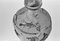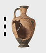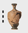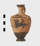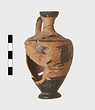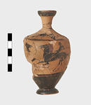 | Description: | Mended from many pieces; the shape complete but a large part of the surface has peeled off. Plump shoulder lekythos; small echinus mouth; flaring ring foot. On the shoulder, a bird, standing right, with spread wings; on the body, two nude riders facing each other: of the left hand horse, only head and forelegs remain. Purple: band around edge of lip, around neck, and around upper edge of glazed lower wall. Also for the horse's mane, and for a broad stripe on his rump. Considerable incision. | |