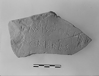 | Description: | Fragment of wall of a large coarse amphora, broken all around. Incised vertically on outside of fragment: <graphic> Light red to buff clay. Cf. Hesperia Suppl. 5 (1941), p. 141, no. 29. | |