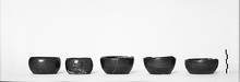 | Description: | Broken but complete except for fragment from rim. Wall gently rounded to plain rim; bottom recessed. Good black glaze; bottom reserved and decorated with central dot and two narrow glaze bands. | |