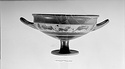 | Description: | Mended from many pieces, part of the rim and fragments of wall missing. Broad disk foot, slightly concave on top, convex on bottom. In the handle zone, panther between two grazing deer, on either side; palmettes beside handles. Added purple for necks of animals and stripes on their bodies; for hearts of palmettes and their central petals. Reserved, underside of foot and its edge; band below figured zone; insides of handles; broad band on inner edge of lip; disk at center of floor, with dot and circle. Fairly good black glaze, somewhat worn. | |