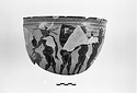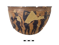 Description:   Mended from many pieces. Nearly half of the body and the rim is preserved. The foot is entirely missing. Traces of one handle. In center, a nude flute player to right. On either side, two male dancers. The figure on the extreme left is standing right but turning back to touch the horn of a bearded goat below the left handle. Three of the dancers wear sprays of ivy. Red for beards and for the neck of the goat. From left to right the figures wear alternately red fillets and white wreaths. Where a white wreath is worn, a red forelock is the rule. The ivy berries were originally white. Offset lip; reserved line round top of mouth.