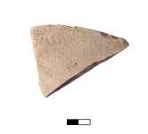 | Description: | From a coarse pot; pink clay with light buff surface; traces of reddish glaze band outside. Incised outside, diagonally and upside-down to the pot: <graphic> | |