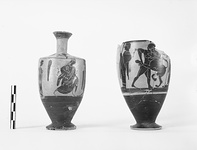 | Description: | Chip missing from foot and from lip; otherwise intact. Shoulder lekythos on spreading foot; neck short and narrow; small flaring lip; black glaze over top of foot and lower wall; and on lip and handle. On the shoulder, palmette with dots in field between two ivy leaves. On wall, draped woman running to right, between two draped figures, standing. A long narrow object behind her in the field. Traces of added color, red and probably white also, on fillet and drapery. Coarse work. | |