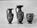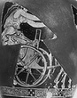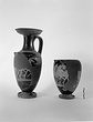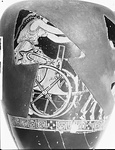 | Description: | Much of the front of the body with the scene preserved; the wall filled out to the shoulder, the foot entirely in plaster, something as P 15840 (ΟΑ 1061) but perhaps too low. Traces of both mastoi preserved on shoulder. For the shape cf. P 15840 and P 15841. Reserved: scraped line at junction of foot and body, above ring; underside of foot. Ornament: maeander band below scene, broken by checkerboard squares at irregular intervals; band not continuous around back of vase; probably no ornament under handle (back of vase not preserved). Figured scene: helmeted female figure (thin Doric chiton girt above the overfold; helmet plume falling to the waist over long curling hair) mounting a chariot drawn by four horses. Before the horses, a youthful male figure (chlamys; sandals laced high) moves right, looking back left toward the team. (Head, shoulders and most of his right side missing). A small non-joining fragment, preserves a bit of maeander and checkboard border with part of some object, probably the toe of this figure's sandalled right foot. Technique: relief contours throughout except for the charioteer's drapery, hair, and helmet crest. Drawing in fine black lines. A little brown shading on the side of the chariot. Hair black to brown; border of chiton black; also harness pole ornament. Horses' eyes filled in with brown around a black pupil; collars brown. Reins black where they cross the necks, but scratched through the glaze where they cross the ground. | |