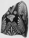 | Description: | Wall fragment from back and one side of vase, with the lower part of the attachment of the triangular handle. Ornament: trace of tongue pattern at shoulder. The base of the handle is outlined with a band of egg pattern. Below and beside the handle, an elaborate palmette and tendril pattern, with acanthus leaves below; at the center an inverted bell. Figured scene: a single figure is preserved, a bearded male, striding right, nude save for cloak over shoulder, petasos, and sandals; (missing: the brows, the brim of the hat, the forearms, the front line of the torso, the left leg below the calf and most of the right foot). The hair, painted in broad black strands over a brown wash, is knotted up at the nape; from this knot escape two long curling tresses, one falling forward over the shoulder, the other hanging down the back. The beard was never painted in. The sandal is elaborately laced to above the ankle; curving out from the back of the leg, at the top of the sandal, is a slender S-shaped projection. Relief contour for petasos, flesh outlines, and for projection from sandal; in the ornament, only for the bell and for the egg pattern. Brown wash for underpainting of hair and on the bell. For the shape, cf. P 15840 and P 15841. | |
