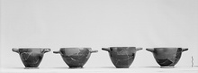 | Description: | Fragments from body and one handle, missing. The wall profile and flaring foot similar to those of the Corinthhian type skyphoi but the fabric is heavier and the handles also. Good black glaze. Reserved: inside of handle and handle space; edge of foot; space inside foot, with very small central circle and dot, and broad glaze band at extreme edge. A scraped line at junction of foot and wall outside. | |