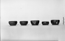 | Description: | Two fragments missing from wall and lip; restored in plaster. Wall rather straight, rising to plain unthickened lip. Base more deeply recessed than in previous pieces; in reserved area of base, a central dot of glaze. Resting surface also reserved. Glaze fairly good, rather dull inside (surface not carefully finished; wheel marks conspicuous on floor). | |