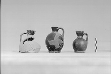 Description:   Fragments of body and most of handle missing; restored in plaster. Plump ovoid body on flat, raised base, slightly projecting. Narrow neck with slightly flaring straight lip. Vertical strap handle from below lip to shoulder. A light ridge at the base of the neck.