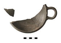 | Description: | Several joining fragments preserve about one-third of lip and bowl, and one handle. No trace of foot on preserved part. One small piece does not join. Broad rather deep bowl with flaring wall, curving over to form a plain drawn-in lip. One horizontal skyphos-like handle preserved, attached to lip. Bucchero(?) ware; coarse gray clay with bits; thin dull black glaze applied thinly and in streaks. | |