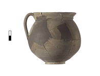 | Description: | Fragments of rim, body and bottom missing; restored in plaster. Flaring rim, set off by a ridge from roundish body; wide mouth. Single vertical handle. Small flat raised base. Grayish clay; unglazed. | |