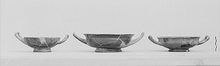 | Description: | One handle and fragments of rim and body missing; restored in plaster. Shape as P 16141 (Δ 717); glazed and stamped decoration similar: at center of floor, four small rough stamped palmettes with connected stems, within a circle of ovules. Dull black glaze, somewhat worn. ADDENDA P 16141: Plain rim; hemispherical body. Rather high ring foot with profiled lower part. Rising horizontal handles. At center of floor, two circles with row of impressed dots between them; inside four palmettes with connected stems. | |